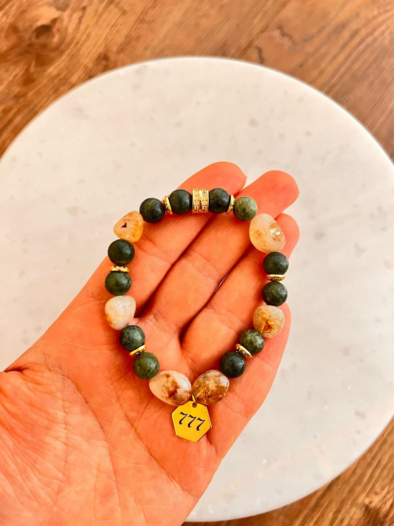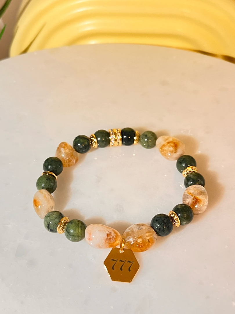 Yeşim ve sitrin taşlarının birleşimiyle hazırlanan bu özel tasarım; bolluk, pozitif gelişmeler ve beklenmedik güzellikleri hayatına çekmek için oluşturuldu.
