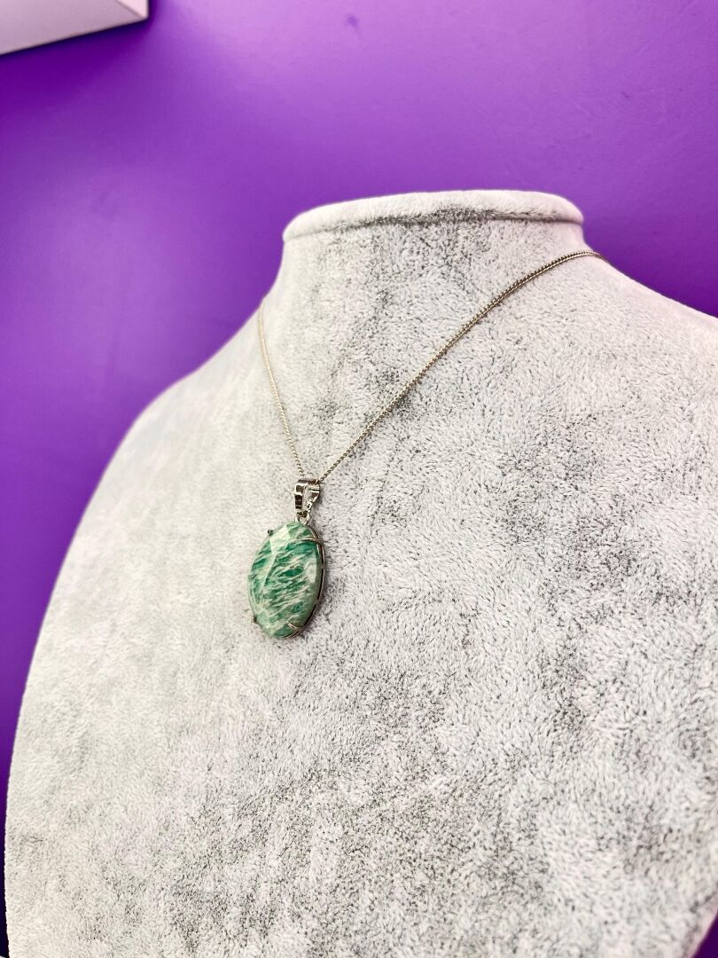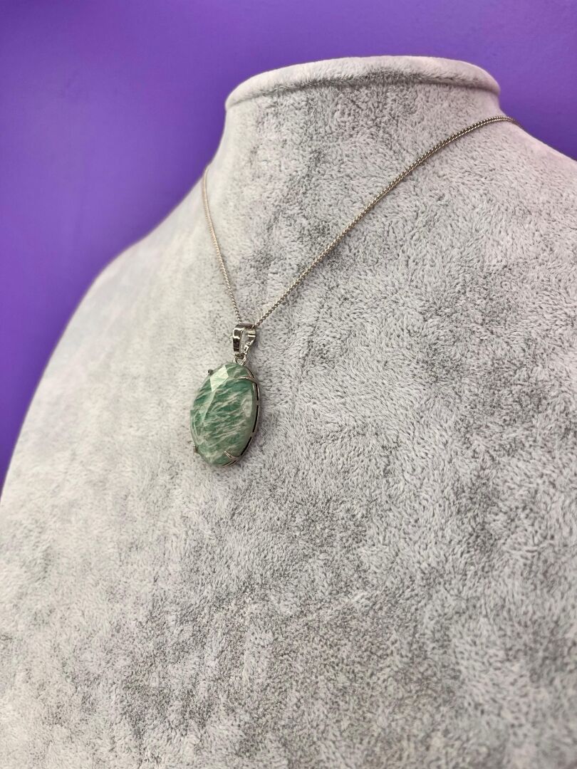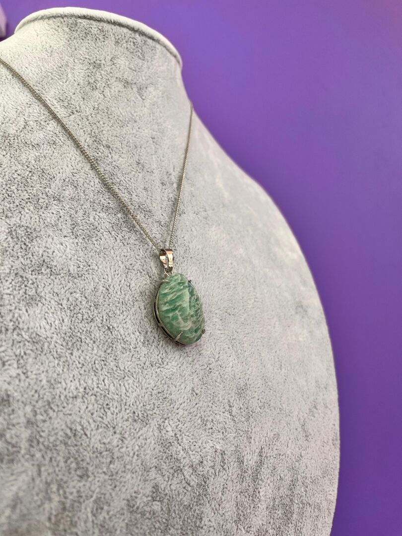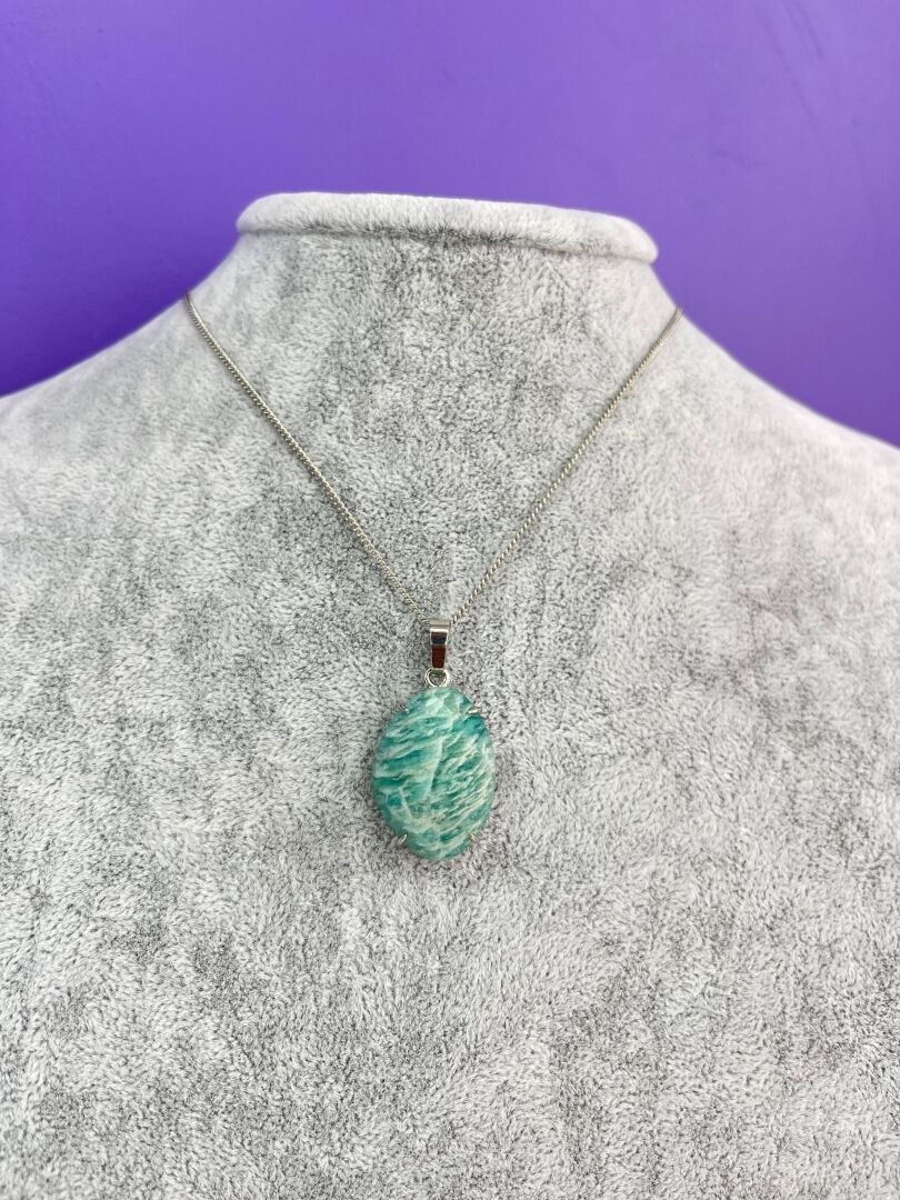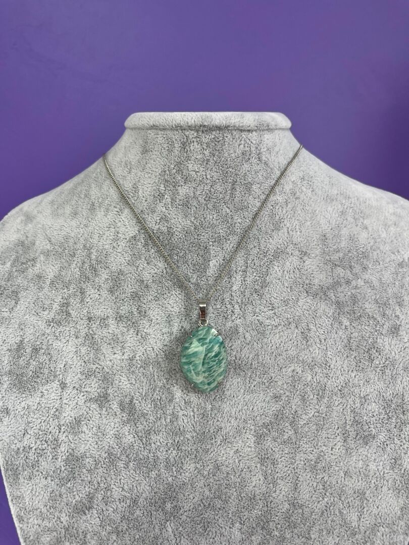 Kolye ucundaki elips form, enerjinin sürekli akışını simgeler. Elips kesim amazonit, taşıdığı frekansı daha geniş bir alana yayarak aurayı nazikçe dengeler. Büyük taş yüzeyi sayesinde hem modern hem etnik kombinlere zarif bir dokunuş katar.