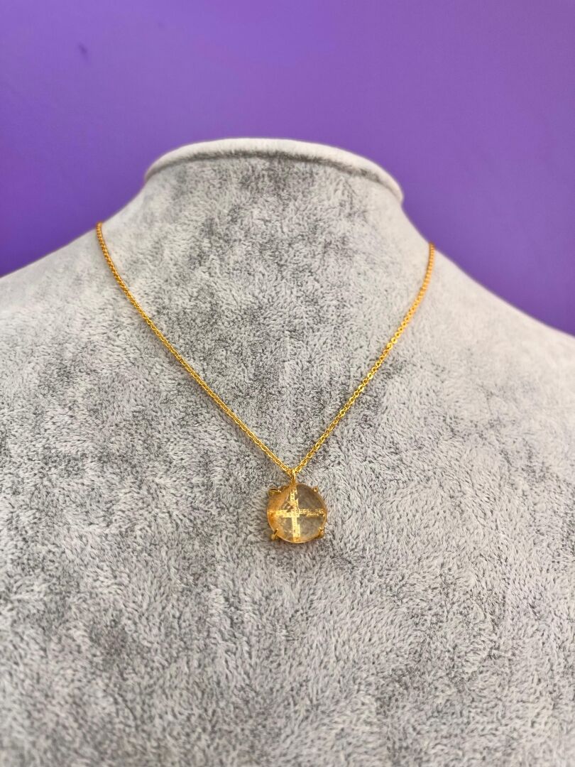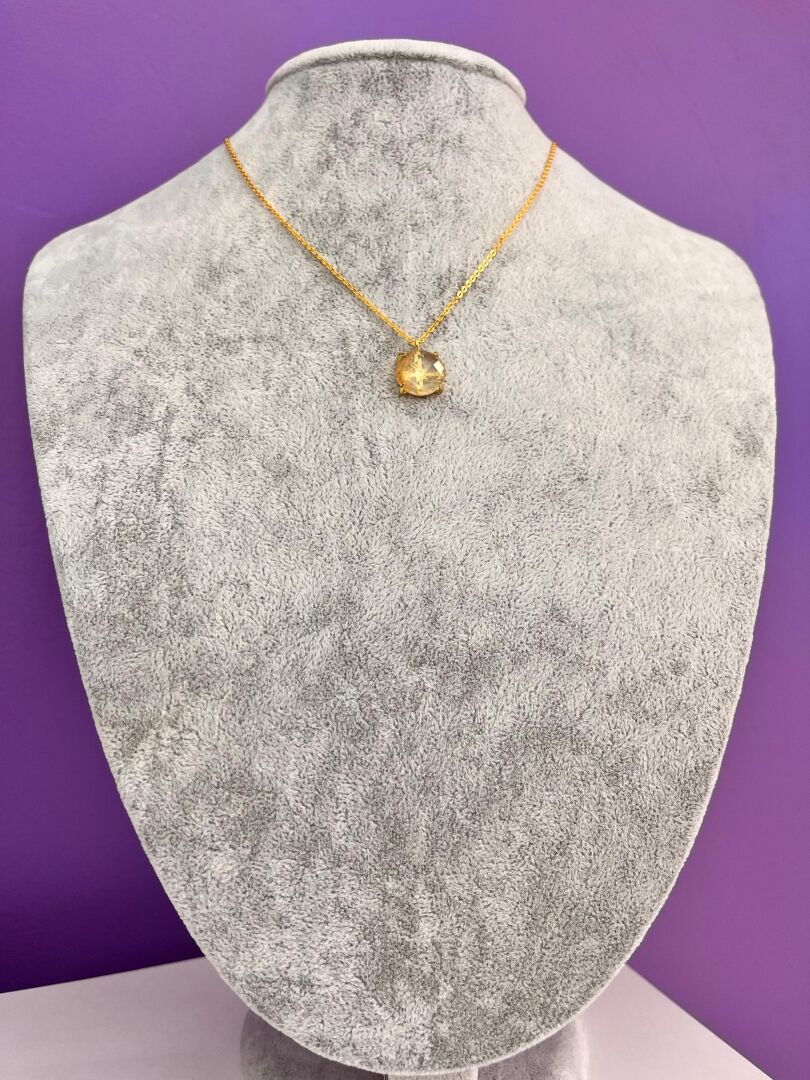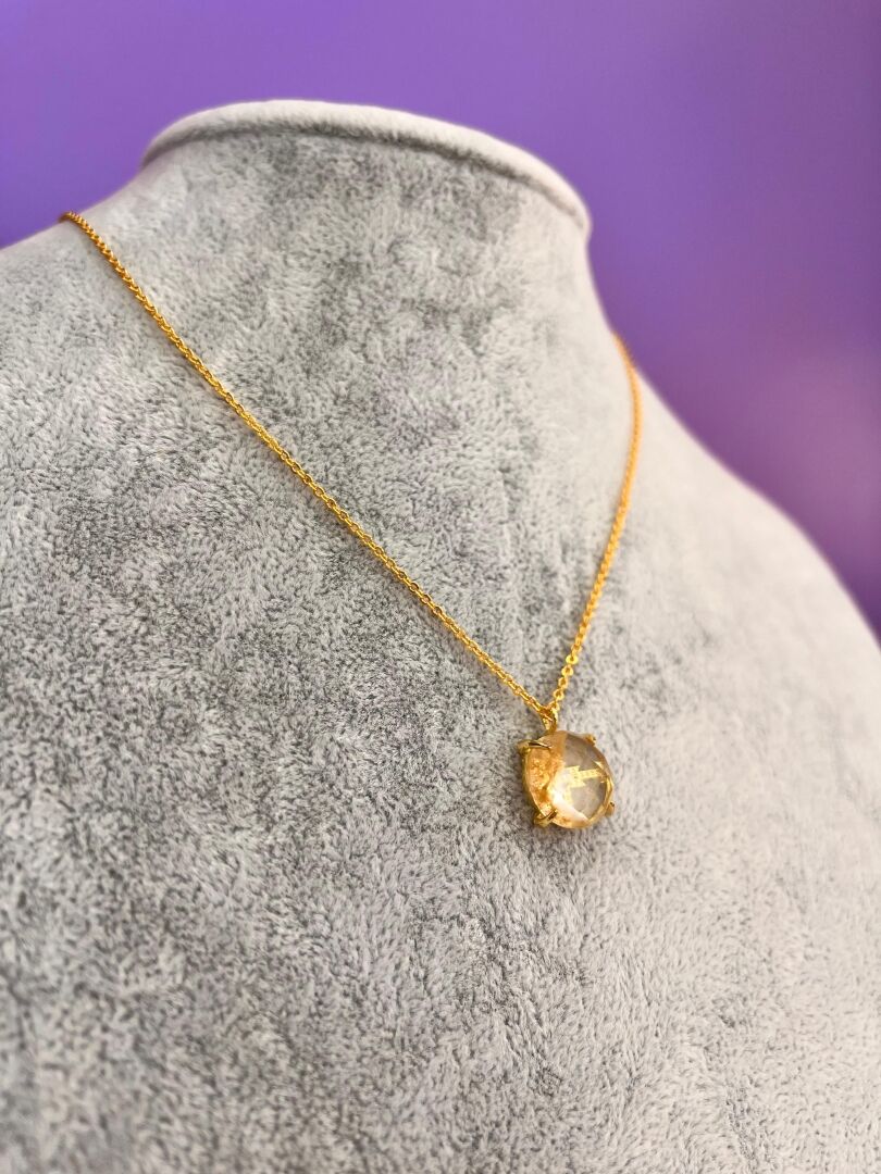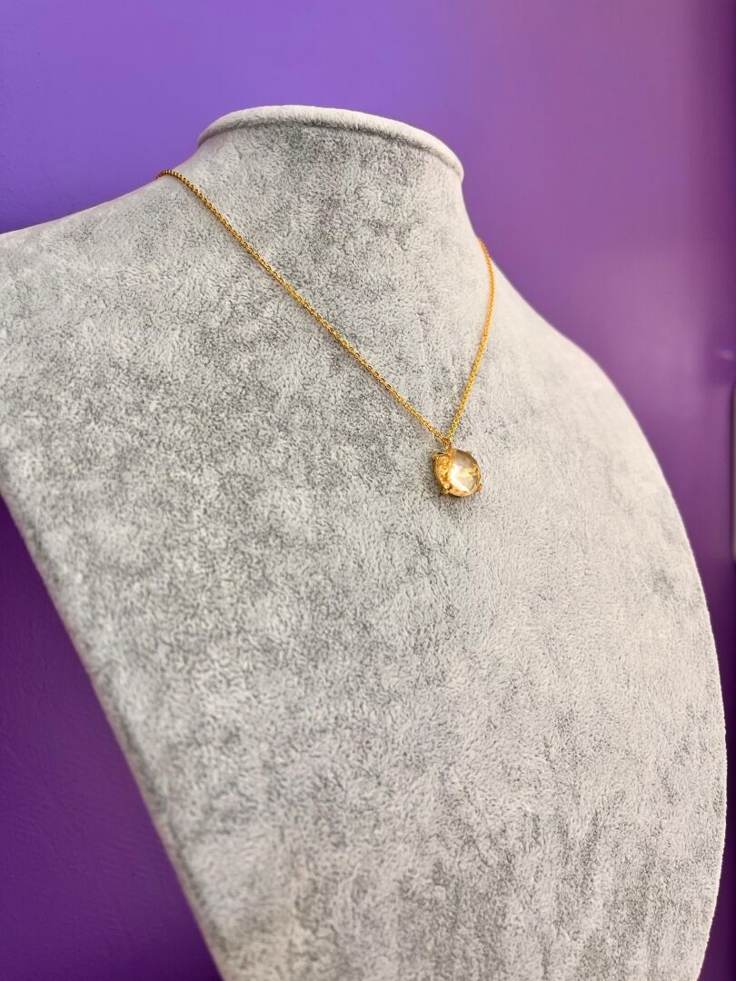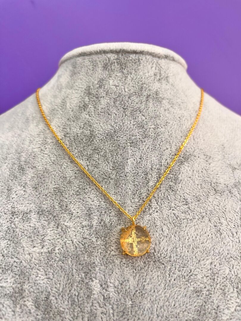 Gelince Haber VerSitrin Taşı Bolluk Bereket Kolyesi – Yuvarlak Kesim, hayatınıza neşe, bolluk ve canlı bir enerji taşımak için özel olarak tasarlanmıştır.